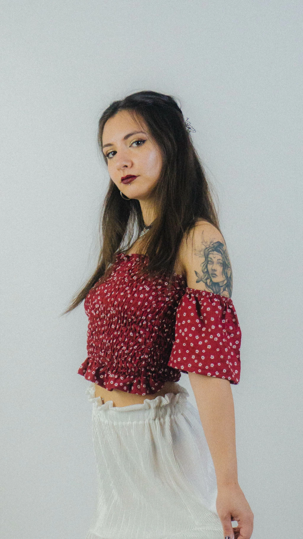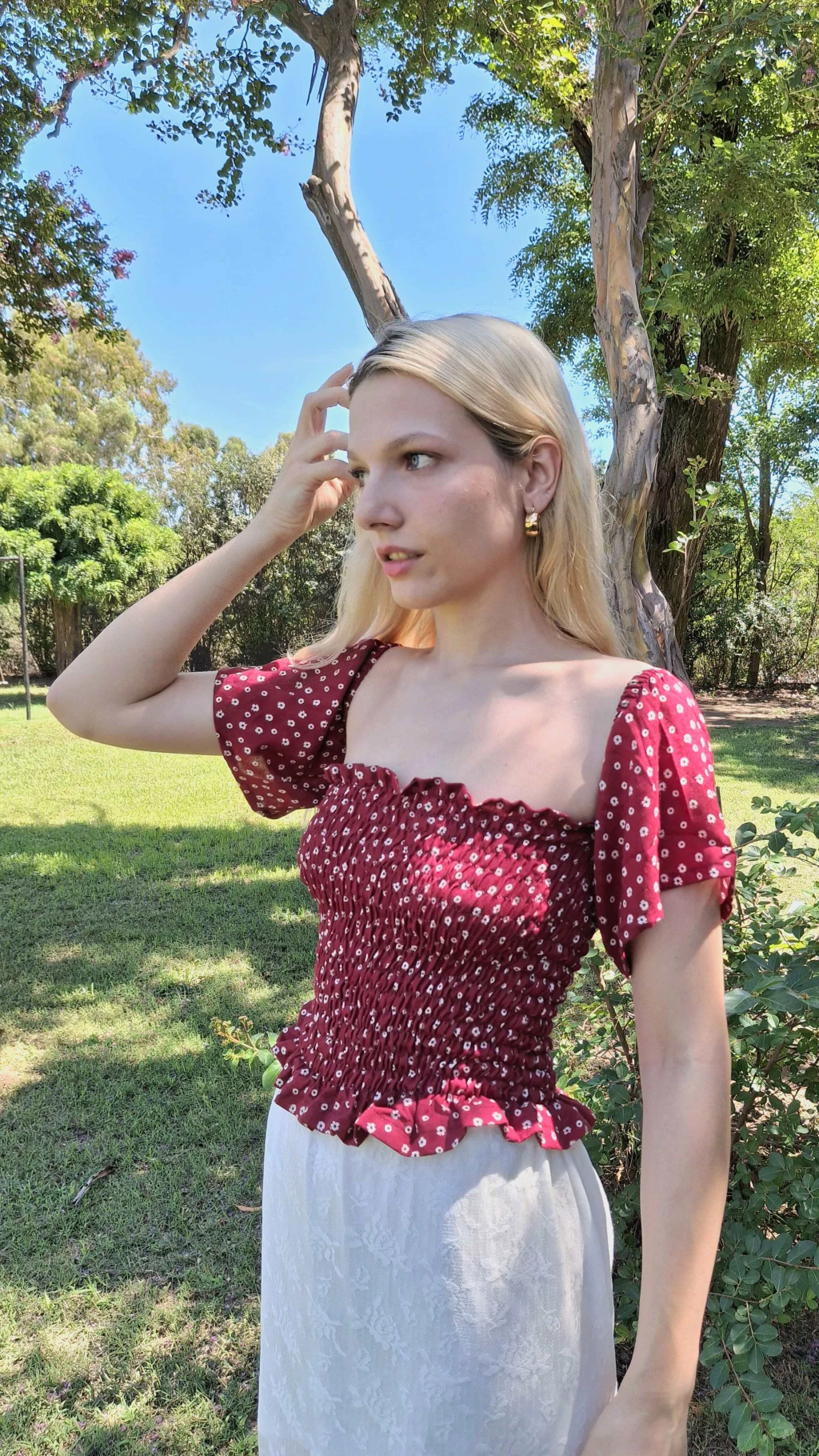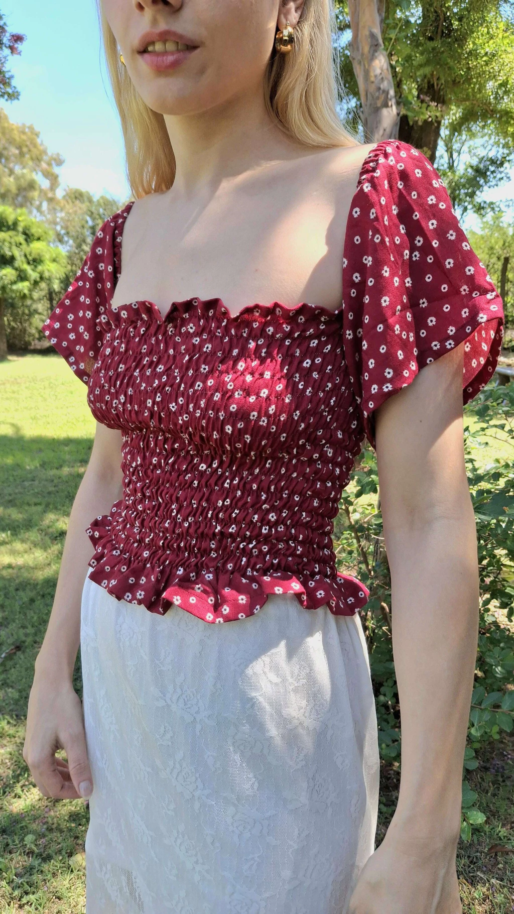 ✨ Confeccionado en crepe liviano, con un encantador fondo bordó y pequeñas flores blancas que le dan un aire femenino y sofisticado.